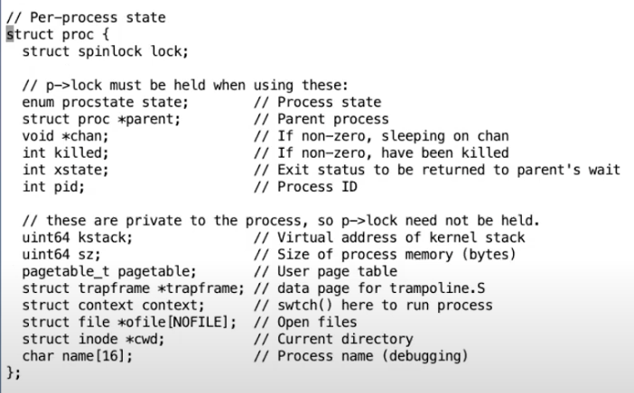lock字段保护了很多数据,目前来说至少保护了对于state字段的更新。举个例子,因为有锁的保护,两个CPU的调度器线程不会同时拉取同一个RUNABLE进程并运行它