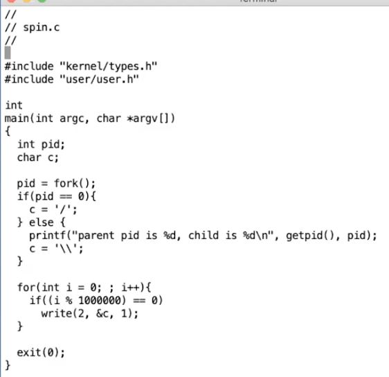 这个程序中会创建两个进程,两个进程会一直运行。代码首先通过fork创建了一个子进程,然后两个进程都会进入一个死循环,并每隔一段时间生成一个输出表明程序还在运行。但是它们都不会很频繁的打印输出(注,每隔1000000次循环才打印一个输出),并且它们也不会主动出让CPU(注,因为每个进程都执行的是没有sleep的死循环)。所以我们这里有了两个运算密集型进程,并且因为我们接下来启动的XV6只有一个CPU核,它们都运行在同一个CPU上。为了让这两个进程都能运行,有必要让两个进程之间能相互切换。