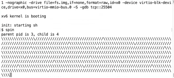 你可以看到一直有字符在输出,一个进程在输出“/”,另一个进程在输出”"。从输出看,虽然现在XV6只有一个CPU核,但是每隔一会,XV6就在两个进程之间切换。“/”输出了一会之后,定时器中断将CPU切换到另一个进程运行然后又输出“\”一会。所以在这里我们可以看到定时器中断在起作用。