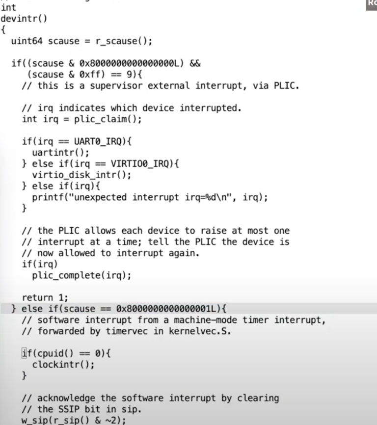 是的,总是需要有一个定时器中断。用户进程的pre-emptive scheduling能工作的原因是,用户进程运行时,中断总是打开的。XV6会确保返回到用户空间时,中断是打开的。这意味着当代码在用户空间执行时,定时器中断总是能发生。在内核中会更加复杂点,因为内核中偶尔会关闭中断,比如当获取锁的时候,中断会被关闭,只有当锁被释放之后中断才会重新打开,所以如果内核中有一些bug导致内核关闭中断之后再也没有打开中断,同时内核中的代码永远也不会释放CPU,那么定时器中断不会发生。但是因为XV6是我们写的,所以它总是会重新打开中断。XV6中的代码如果关闭了中断,它要么过会会重新打开中断,然后内核中定时器中断可以发生并且我们可以从这个内核线程切换走,要么代码会返回到用户空间。我们相信XV6中不会有关闭中断然后还死循环的代码。