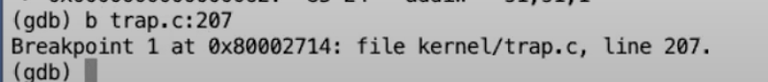 接下来,我在trap.c的devintr函数中的207行设置一个断点,这一行会识别出当前是在响应定时器中断。