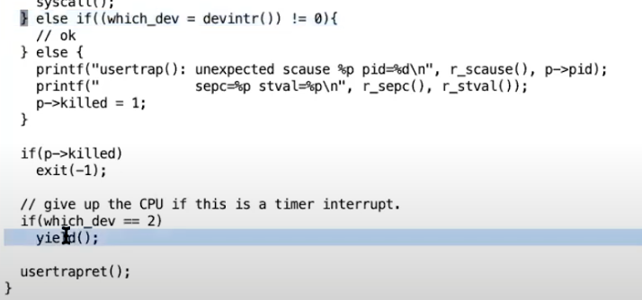 回到devintr函数返回到usertrap函数中的位置。在gdb里面输入几次step走到yield函数的调用。yield函数是整个线程切换的第一步,下面是yield函数的内容: