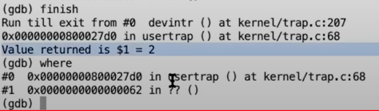 因为devintr函数处理定时器中断的代码基本没有内容,接下来我在gdb中输入finish来从devintr函数中返回到usertrap函数。当我们返回到usertrap函数时,虽然我们刚刚从devintr函数中返回,但是我们期望运行到下面的yield函数。所以我们期望devintr函数返回2。