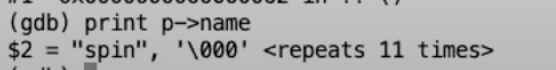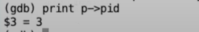 在yield函数中,当前进程会出让CPU并让另一个进程运行。这个我们稍后再看。现在让我们看一下当定时器中断发生的时候,用户空间进程正在执行什么内容。我在gdb中输入print p来打印名称为p的变量。变量p包含了当前进程的proc结构体。