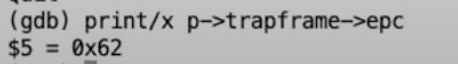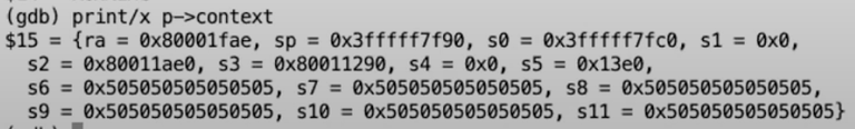 我们还可以通过打印变量p的trapframe字段获取表示用户空间状态的32个寄存器,这些都是我们在Lec06中学过的内容。这里面最有意思的可能是trapframe中保存的用户程序计数器。