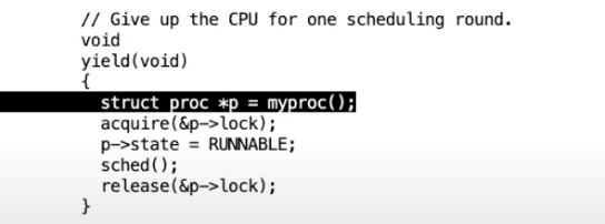 接下来yield函数中将进程的状态改为RUNABLE。这里的意思是,当前进程要出让CPU,并切换到调度器线程。当前进程的状态是RUNABLE意味着它还会再次运行,因为毕竟现在是一个定时器中断打断了当前正在运行的进程。