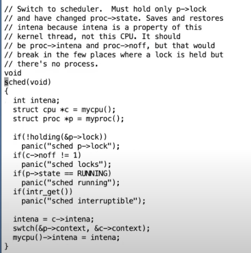 第二,当我们开始要运行一个进程时,p->lock也有类似的保护功能。当我们要运行一个进程时,我们需要将进程的状态设置为RUNNING,我们需要将进程的context移到RISC-V的寄存器中。但是,如果在这个过程中,发生了中断,从中断的角度来说进程将会处于一个奇怪的状态。比如说进程的状态是RUNNING,但是又还没有将所有的寄存器从context对象拷贝到RISC-V寄存器中。所以,如果这时候有了一个定时器中断将会是个灾难,因为我们可能在寄存器完全恢复之前,从这个进程中切换走。而从这个进程切换走的过程中,将会保存不完整的RISC-V寄存器到进程的context对象中。所以我们希望启动一个进程的过程也具有原子性。在这种情况下,切换到一个进程的过程中,也需要获取进程的锁以确保其他的CPU核不能看到这个进程。同时在切换到进程的过程中,还需要关闭中断,这样可以避免定时器中断看到还在切换过程中的进程。(注,这就是为什么468行需要加锁的原因)