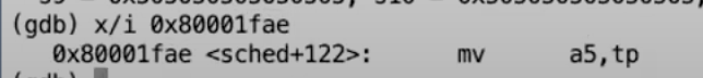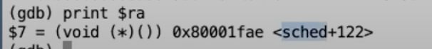 通过打印这个地址的内容,可以看到swtch函数会返回到sched函数中。这完全在意料之中,因为可以预期的是,将要切换到的进程之前是被定时器中断通过sched函数挂起的,并且之前在sched函数中又调用了swtch函数。