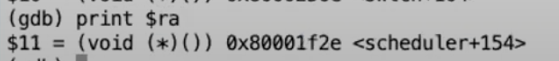 输出中包含了地址中的指令和指令所在的函数名。所以我们将要返回到scheduler函数中。