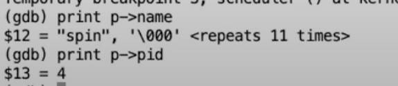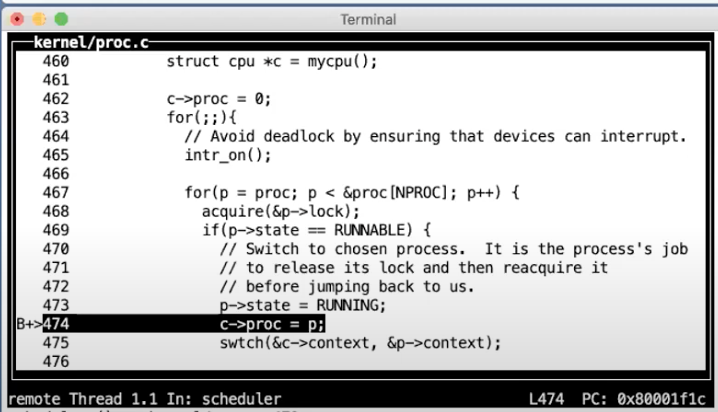现在我们在scheduler函数的循环中,代码会检查所有的进程并找到一个来运行。现在我们知道还有另一个进程,因为我们之前fork了另一个spin进程。这里我跳过进程检查,直接在找到RUNABLE进程的位置设置一个断点。