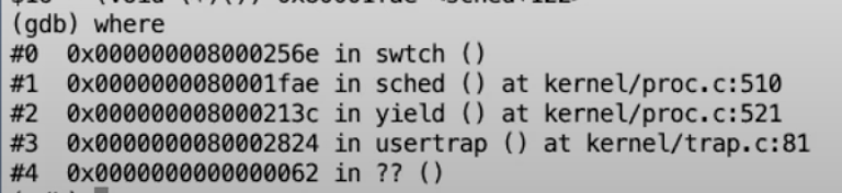 我们可以看到,之前有一个usertrap的调用,这必然是之前因为定时器中断而出现的调用。之后在中断处理函数中还调用了yield和sched函数,正如我们之前看到的一样。但是,这里调用yield和sched函数是在pid为4的进程调用的,而不是我们刚刚看的pid为3的进程。