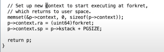 实际上大部分寄存器的内容都无所谓。但是ra很重要,因为这是进程的第一个switch调用会返回的位置。同时因为进程需要有自己的栈,所以ra和sp都被设置了。这里设置的forkret函数就是进程的第一次调用swtch函数会切换到的“另一个”线程位置。