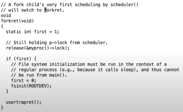 文件系统需要被初始化,具体来说,需要从磁盘读取一些数据来确保文件系统的运行,比如说文件系统究竟有多大,各种各样的东西在文件系统的哪个位置,同时还需要有crash recovery log。完成任何文件系统的操作都需要等待磁盘操作结束,但是XV6只能在进程的context下执行文件系统操作,比如等待I/O。所以初始化文件系统需要等到我们有了一个进程才能进行。而这一步是在第一次调用forkret时完成的,所以在forkret中才有了if(first)判断。