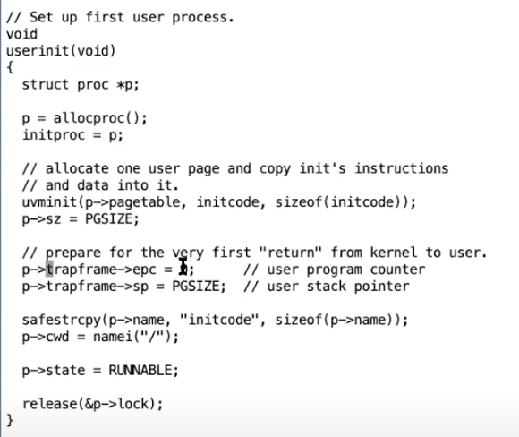 从代码中看,它的工作其实就是释放调度器之前获取的锁。函数最后的usertrapret函数其实也是一个假的函数,它会使得程序表现的看起来像是从trap中返回,但是对应的trapframe其实也是假的,这样才能跳到用户的第一个指令中。